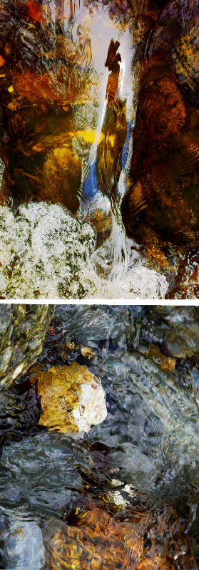 Des heures passées dans les rivières, les mers, les lacs, les flaques, à saisir le moment magique où la lumière éphémère offre à l’eau ses plus beaux apparats. Cet instant figé, magnifique, riche, nous émerveille, nous questionne et nous entraîne dans un imaginaire sans limite. Ces moments captés par l’oeil acéré et poétique de la photographe méritent bien d’être libérés. Ainsi jaillit l’idée du spectacle où les images projetées s’animent, se mêlent, s’entrechoquent, fusionnent et se confondent. Elles chantent, elles bercent et… l’eau nous raconte, elle a tant à nous dire !